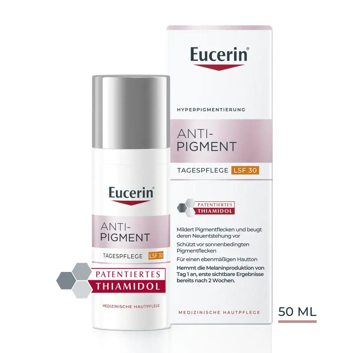 Eucerin Anti-Pigment dnevna njega sa SPF 30 sadrži thiamidol, djelotvoran i patentiran sastojak koji djeluje na pojavu hiperpigmentacije smanjenjem proizvodnje melanina. Klinički i dermatološki dokazano smanjuju tamne mrlje i sprječava njihovo ponovno pojavljivanje. Prvi rezultati su vidljivi nakon dva tjedna i kontinuirano se poboljšavaju uslijed redovite primjene.