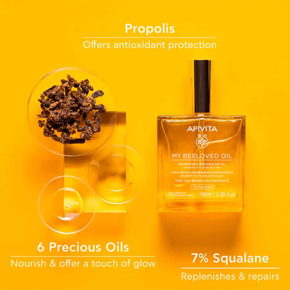 Obogaćeno propolisom koji štiti od svih vanjskih agresora i ojačava antioksidativnu zaštitu kože. 6 dragocjenih ulja dubinski njeguju i daju trenutni efekt blistavosti.