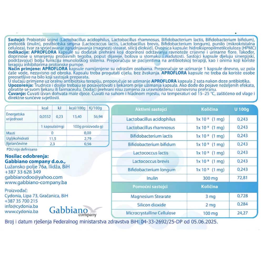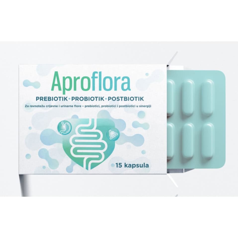 Aproflora kapsule su sastavljene od svoje prebiotske komponente, koja predstavlja izvor energije za same probiotske komponente, te postbiotika koji pojačavaju djelovanje probiotika. Time se ostvaruje sinergija između tri komponente proizvoda pomoću koje se osigurava bolje varenje hrane, detoksikacija organizma, borba protiv patogenih organizama koji ulaze u digestivni i urinarni trakt, te ublažavanje mnogih poremećaja digestivnog i urinarnog trakta. Ovojnica kapsule je od hidroksipropilmetil celuloze (bez životinjskog porijekla).