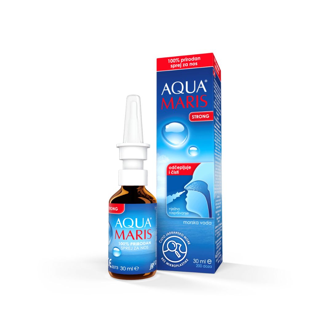 Aqua Maris Strong hipertonični sprej s čistom morskom vodom prirodno odčepljuje nos, smanjuje oticanje sluznice i olakšava disanje kod prehlade, alergije i gripe, bez rizika od ovisnosti.
