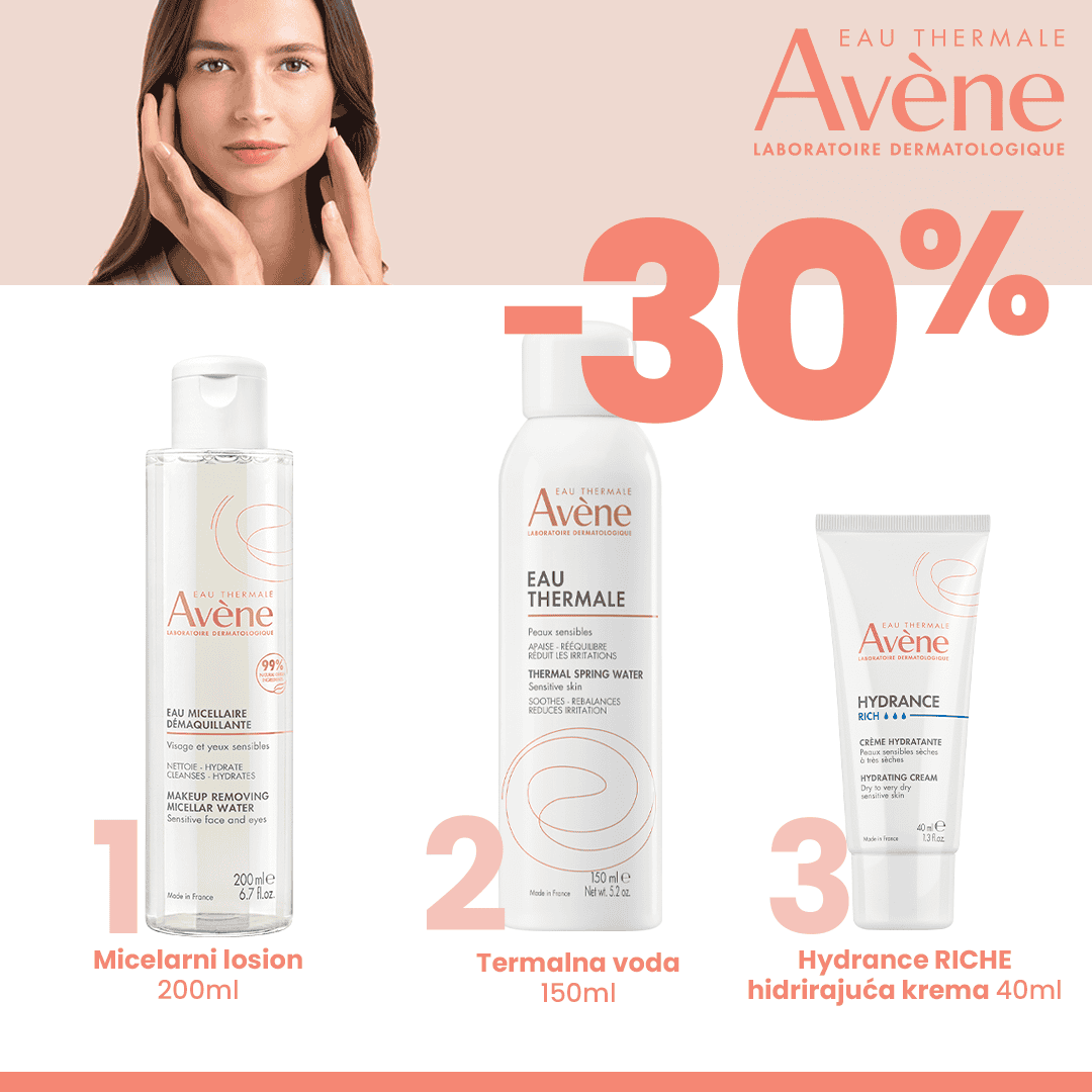 Zahvaljujući hidrirajućem djelovanju ove bogate kreme, hidracija postaje osnova rutine ljepote za osjetljivu, suhu do vrlo suhu dehidriranu kožu. Hydrance Bogata hidrirajuća krema osigurava koži nadopunu Avène termalnom izvorskom vodom za hidriranu kožu tijekom 24 sata. Njezina bogata, neljepljiva tekstura ostavlja kožu gipkom, ugodnom i umirenom tijekom cijelog dana, dok njezin nježan miris budi osjetila. Dostupna i sa SPF 30 UV zaštitom.
