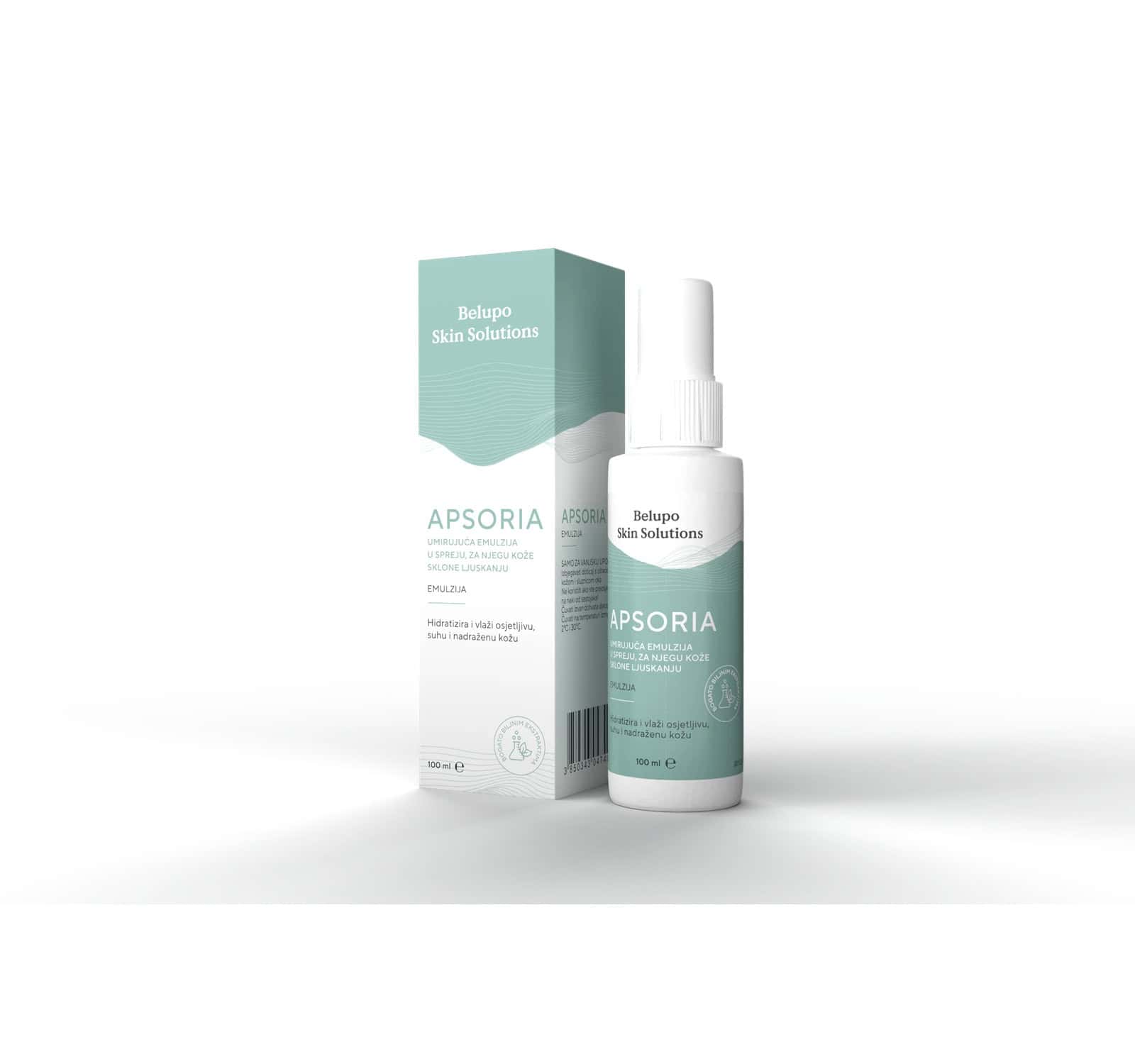 Belupo Skin Solutions APSORIA je umirujuća emulzija u spreju, namijenjena za hidrataciju i vlaženje suhe i nadražene kože, idealna i za vlasište i za tijelo. Hidratizira i vlaži osjetljivu, suhu i nadraženu kožu.