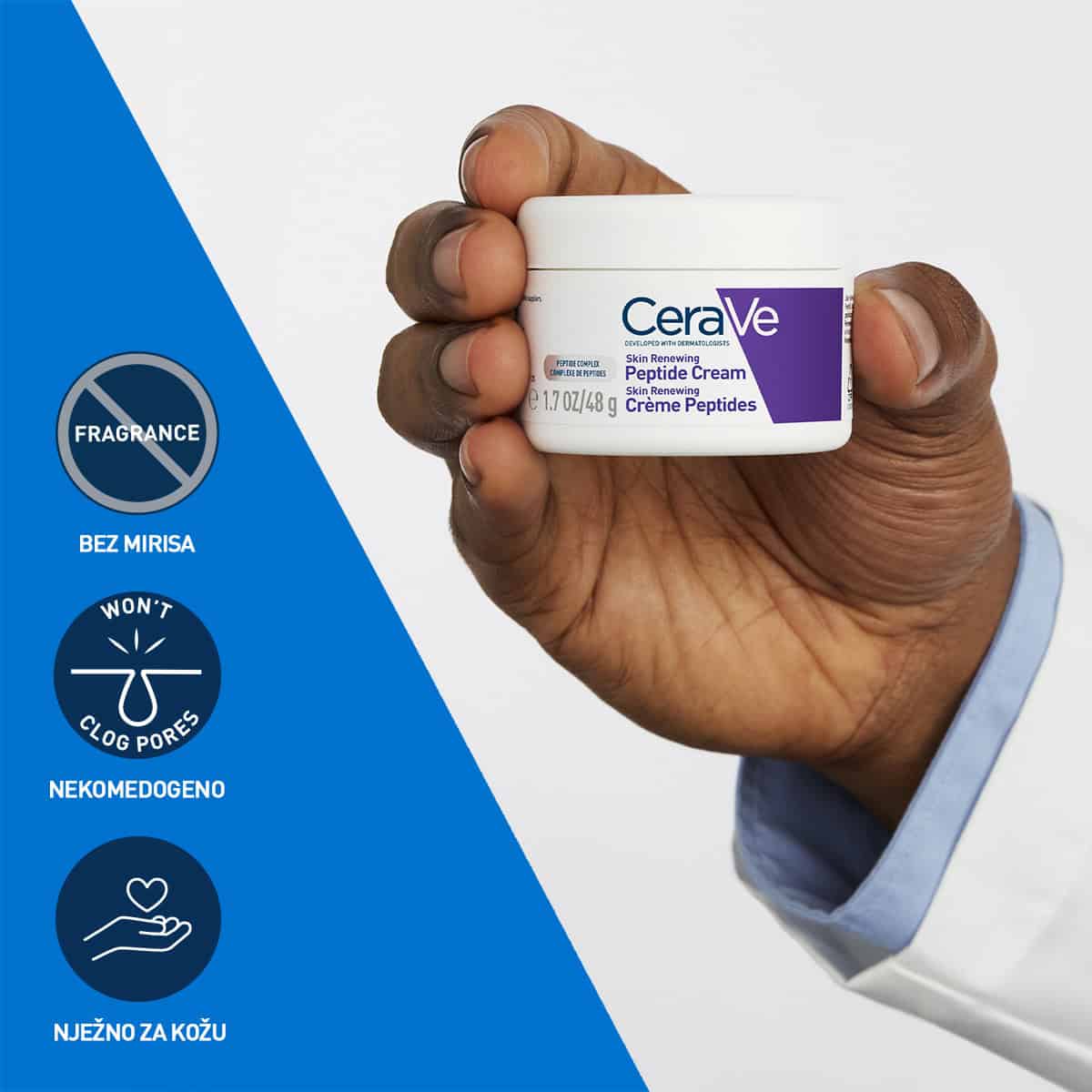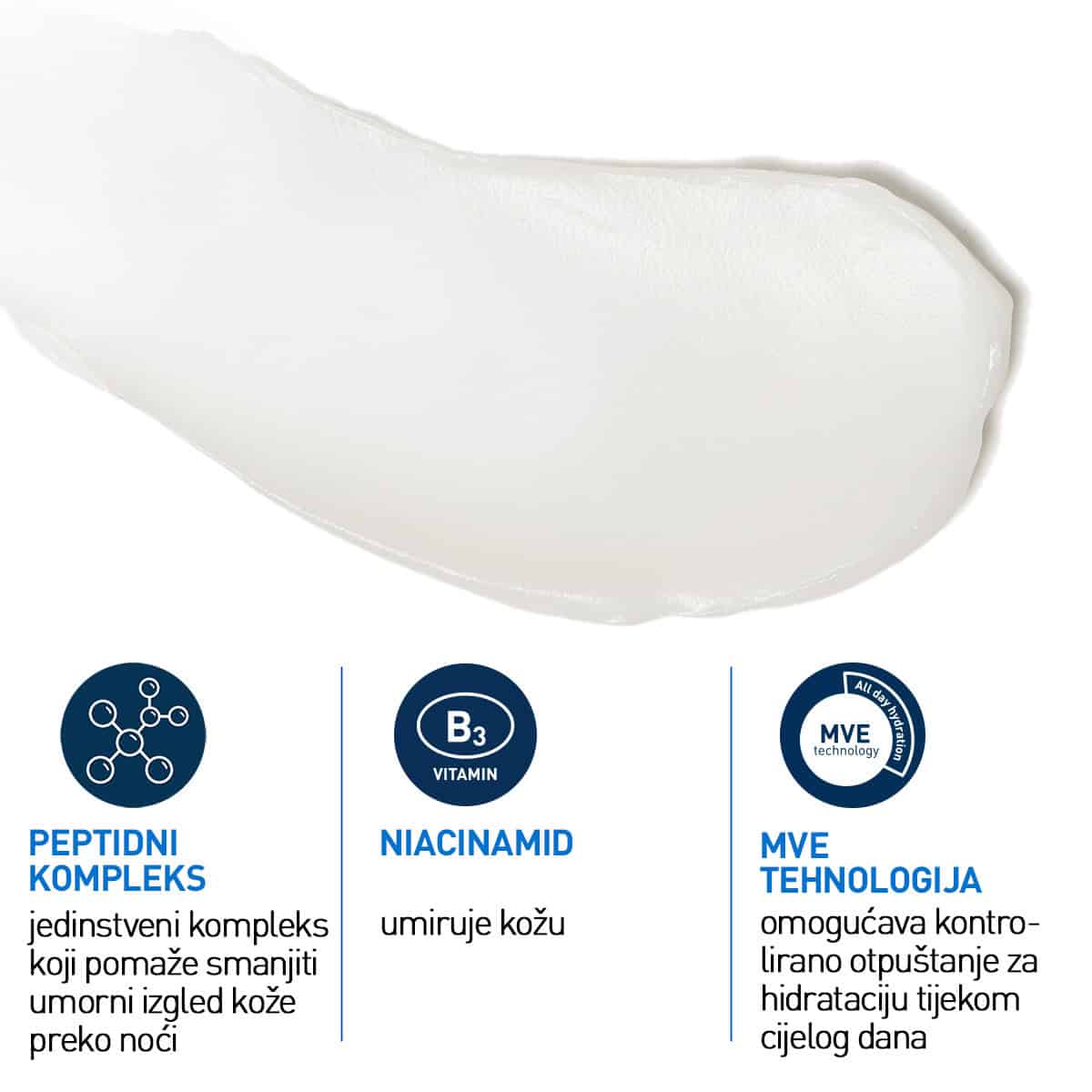 Pogodna za sve tipove kože, CeraVe noćna krema za obnovu kože sadržava kompleks biomimetičkih peptida, hijaluronsku kiselinu i tri esencijalna ceramida koji zajedno zadržavaju vlažnost kože i pomažu obnoviti zaštitnu barijeru vaše kože tijekom noći. Naša noćna krema za obnovu kože bez masnog osjećaja koja intenzivno hidrira kožu namijenjena je omekšavanju i obnovi izgleda umorne kože, a naša patentirana tehnologija MVE sadržava ceramide kako bi se osigurao učinkovit prodor u kožnu barijeru i sporo otpuštanje tijekom vremena. Podržava vašu zaštitnu barijeru kože, dugo nakon nanošenja, kako biste izgledali odmoreno i pomlađeno kad se probudite.