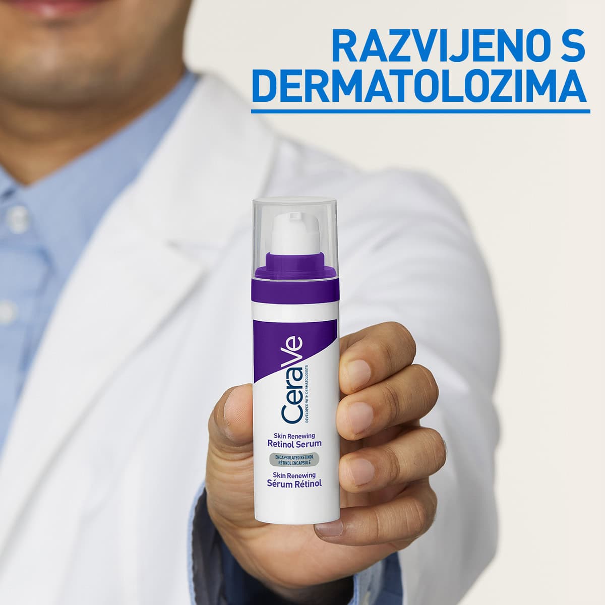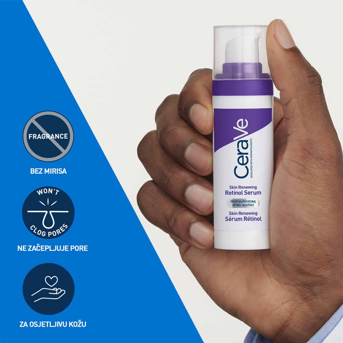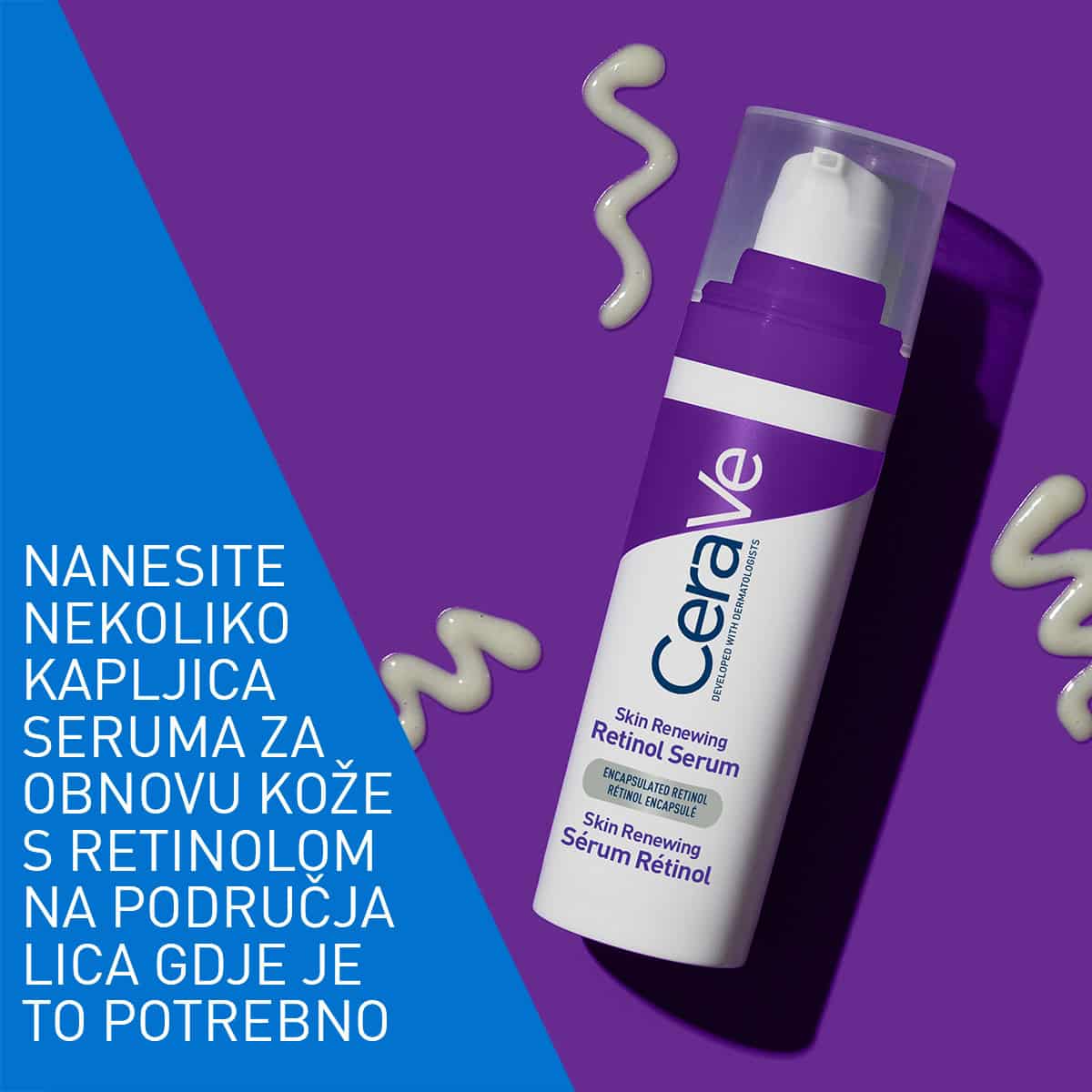 CeraVe serum za obnovu kože s retinolom blag je, ali učinkovit serum s retinolom za svakodnevnu upotrebu koji vašoj koži pruža niz pogodnosti za sprječavanje znakova starenja. Naš serum za lice s retinolom sadržava sastojke kao što su hijaluronska kiselina za dodatnu hidraciju, niacinamid za umirenje kože i tri esencijalna ceramida koji zajedno zadržavaju vlažnost kože i pomažu obnoviti njezinu zaštitnu barijeru. Također primjenjuje tehnologiju MVE koja sadržava ceramide kako bi se osigurao učinkovit prodor u kožnu barijeru i sporo otpuštanje tijekom vremena, pružajući podršku vašoj kožnoj barijeri još dugo vremena nakon nanošenja seruma.