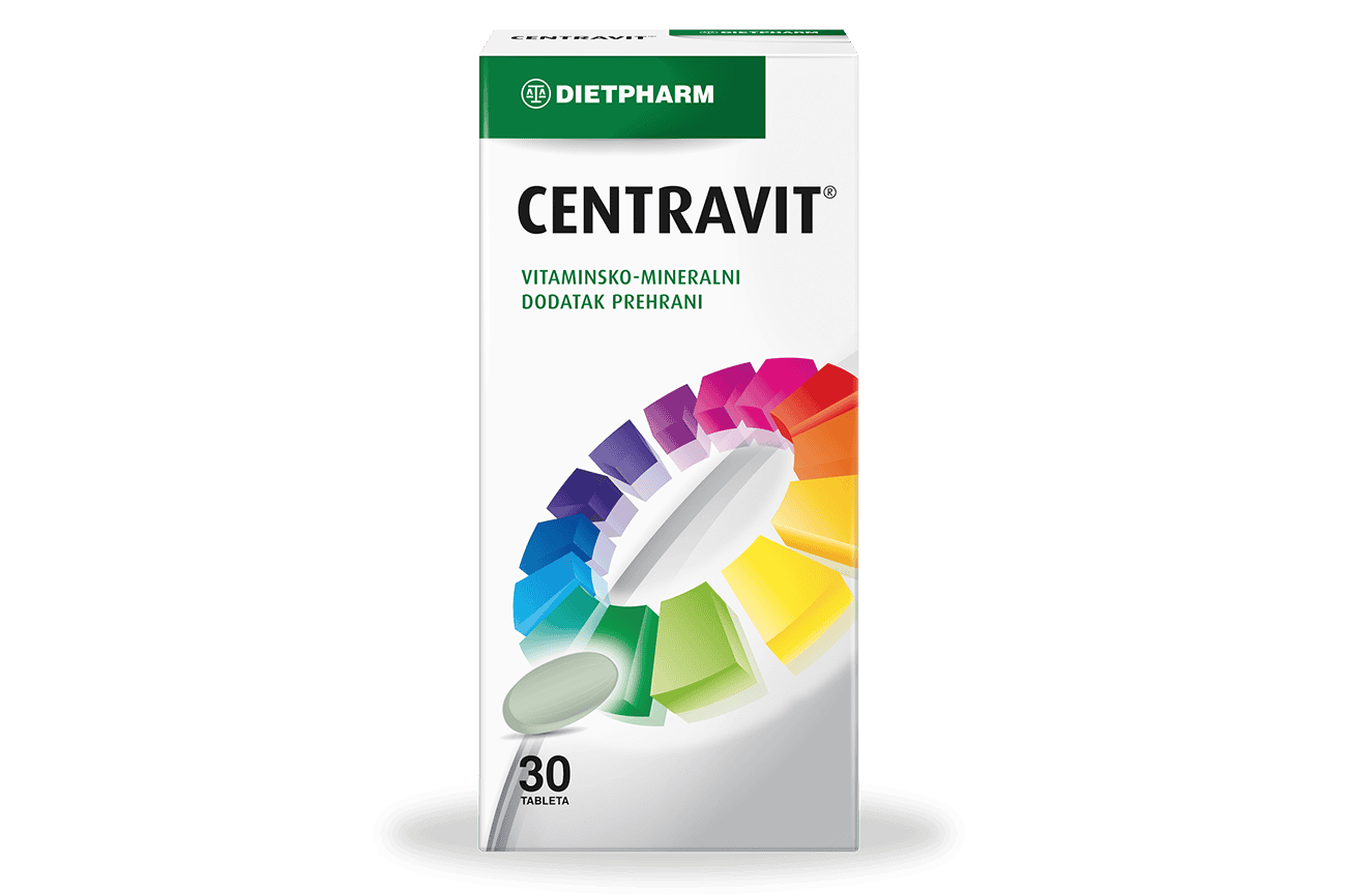 Centravit® tablete su vitaminsko-mineralni dodatak prehrani. Sadrže 23 vitamina i minerala u pomno uravnoteženim količinama važnim za normalno funkcioniranje organizma. Riboflavin (Vitamin B2), niacin, pantotenska kiselina, Vitamin B6 , folati (folna kiselina), Vitamin B12, Vitamin C, željezo i magnezij doprinose smanjenju umora i iscrpljenosti. Vitamin A, Vitamin D, bakar, cink i selen doprinose normalnoj funkciji imunološkog sustava. Proizvod je dostupan u pakiranju od 30 i 50 kapsula.