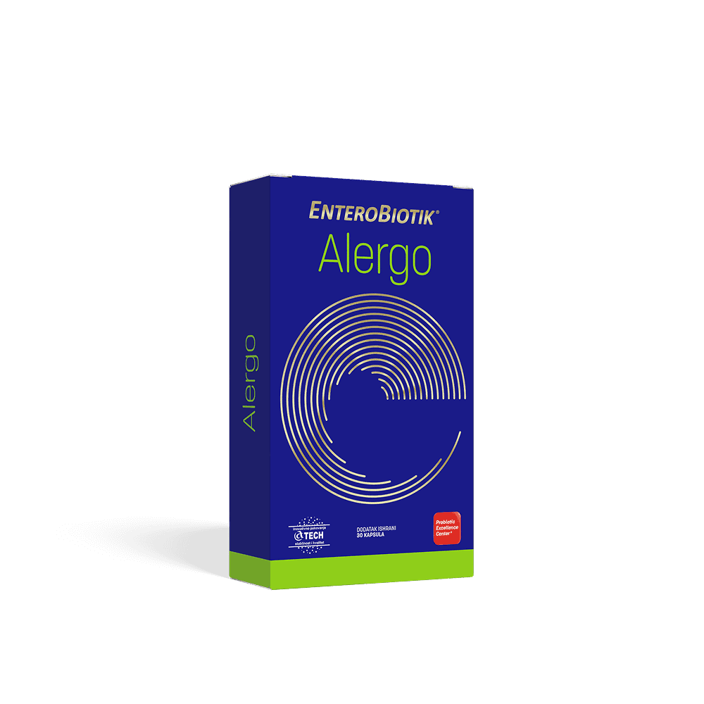 EnteroBiotik® Alergo, kapsule je dijetetski suplement sa 2 soja korisnih bakterija (Lactisaseibacillius paracasei i Lacticaseibacillius rhamnosus) i kvercetinom u fosfolipidnom kompleksu.