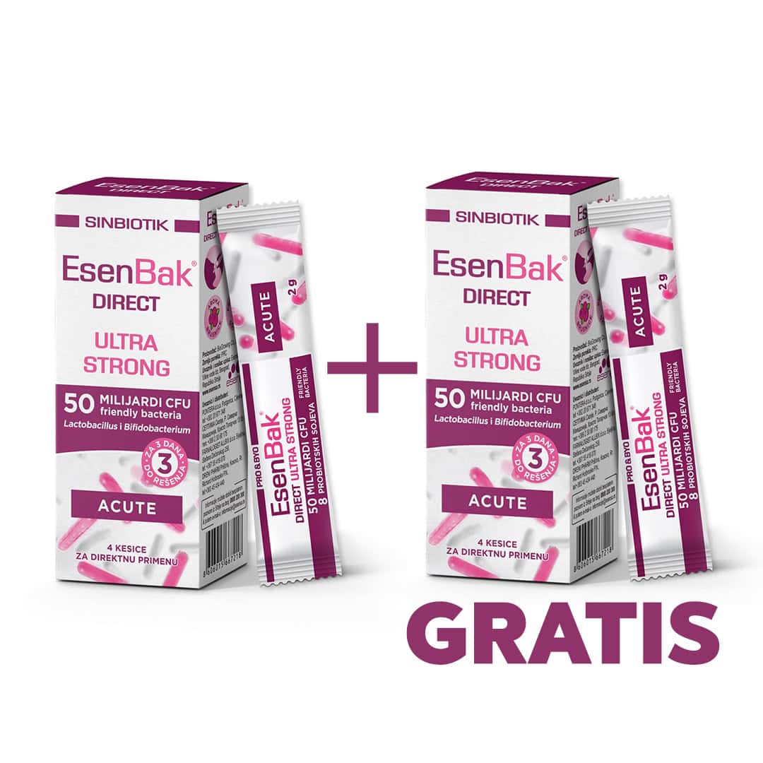 EsenBak® Direct Ultra Strong sinbiotik doprinosi pravilnoj funkciji digestivnog sistema i posebno je koristan u slučaju akutne dijareje, bilo koje etiologije (infektivna dijareja, dijareja izazvana antibioticima iii drugim lijekovima i terapijama, dijareja nastala usljed nagle promjene načina ishrane i slično).