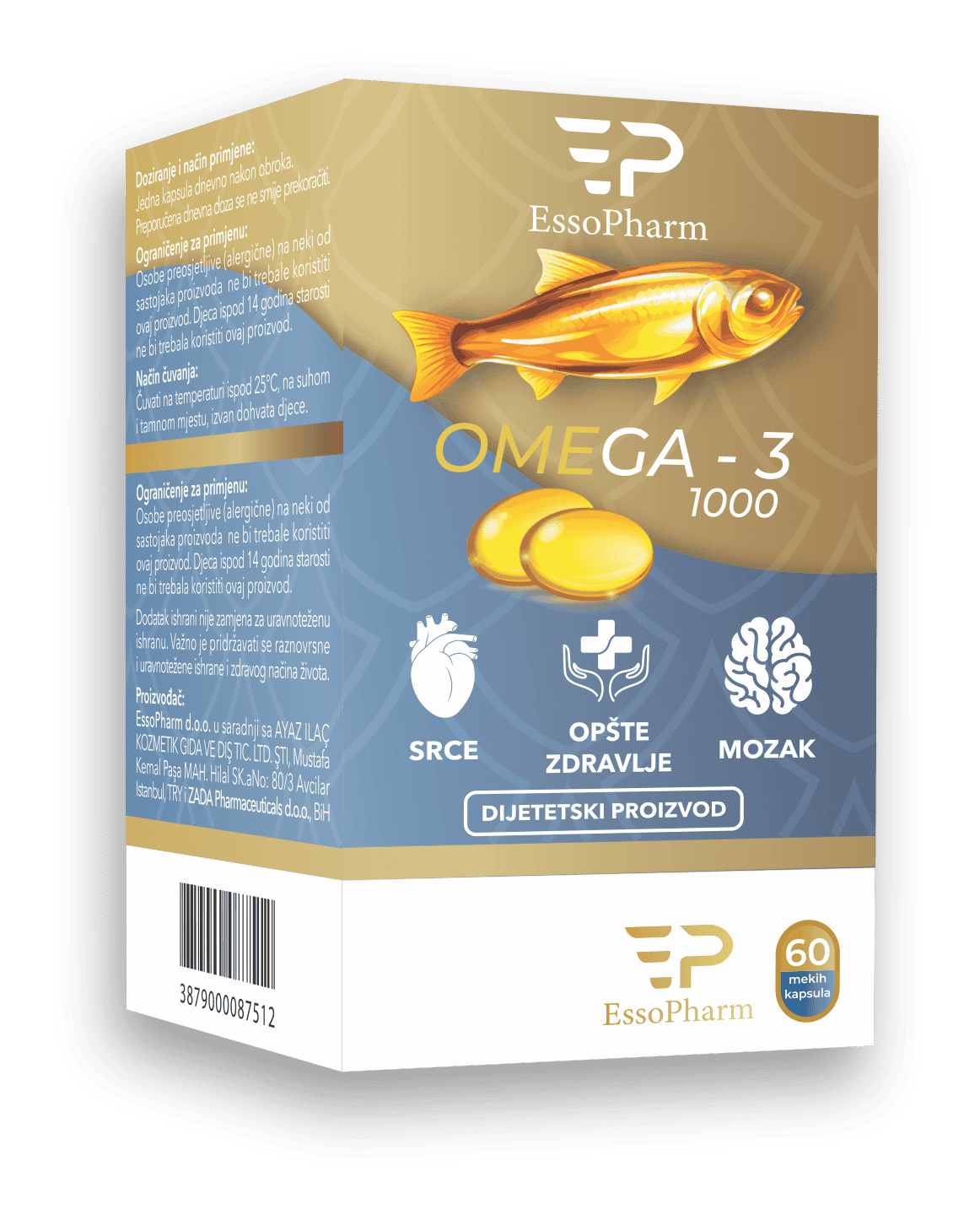 Omega-3 1000 je visokokvalitetni dodatak prehrani u obliku mekih kapsula, namijenjen podršci zdravlja srca, mozga i očiju. Svaka kapsula sadrži 1000 mg omega-3 masnih kiselina, uključujući EPA (eikozapentaensku kiselinu) i DHA (dokozaheksaensku kiselinu), ključne komponente za normalnu funkciju organizma.
