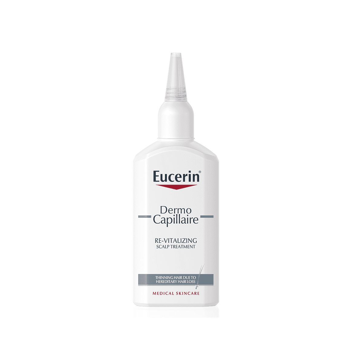 Posebno je dizajniran za osobe s oštećenjem kose uzrokovanog nasljednim gubitkom kose. Sadrži dvije aktivne tvari koje se prirodno nalaze u tijelu, karnitin i kreatin koje pomažu ojačati korijen kose podržavajući njegovu opskrbu energijom te umirujući licochalcone A, za uklanjanje mikroupale koja oslabljuje korijen kose. Kad se redovito koristi, podupire rast kose i stimulira folikul kose. Za optimalne rezultate koristiti u kombinaciji s Eucerin DermoCapillaire revitalizirajućim šamponom.