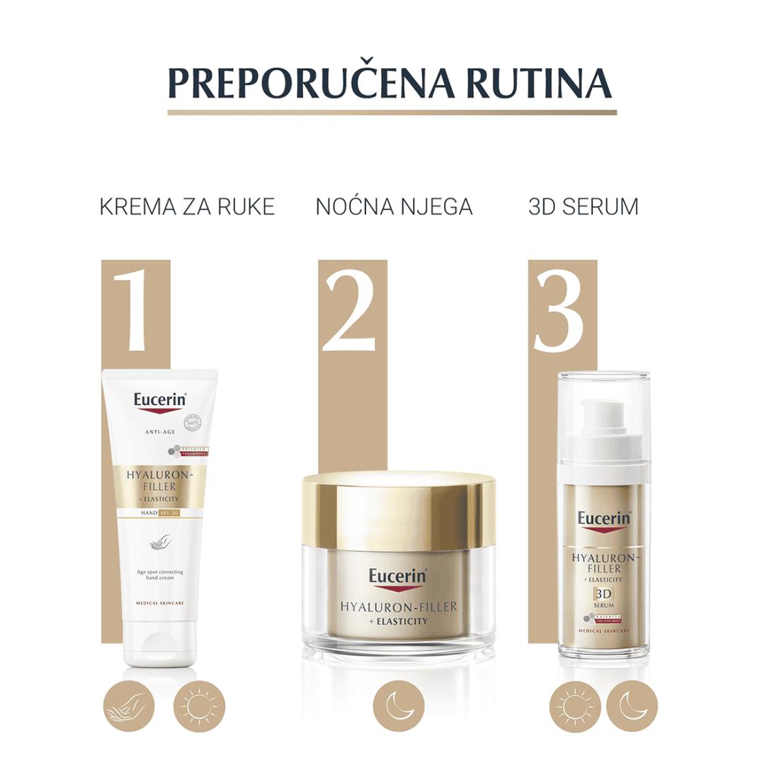 Eucerin Hyaluron-Filler + Elasticity Krema za ruke je formulisana da pruži nekoliko anti-age efekata. Inovativna Eucerin kombinacija hijaluronske kiseline dugog i kratkog lanca vidljivo popunjava duboke bore i deluje u kombinaciji sa arktinom, aktivnim sastojkom koji dokazano ubrzava obnavljanje kolagena u ćelijama kože. Ona takođe sadrži Thiamidol®, efekasan i patentom zaštićen sastojak koji deluje u korenu nastanka hiperpigmentacija tako što smanjuje proizvodnju melanina. Klinički i dermatološki dokazano ublažava tamne fleke i sprečava njihov povratak. Prvi rezultati su vidljivi posle dve nedelje i kontinuiano se poboljšavaju sa redovnom upotrebom.