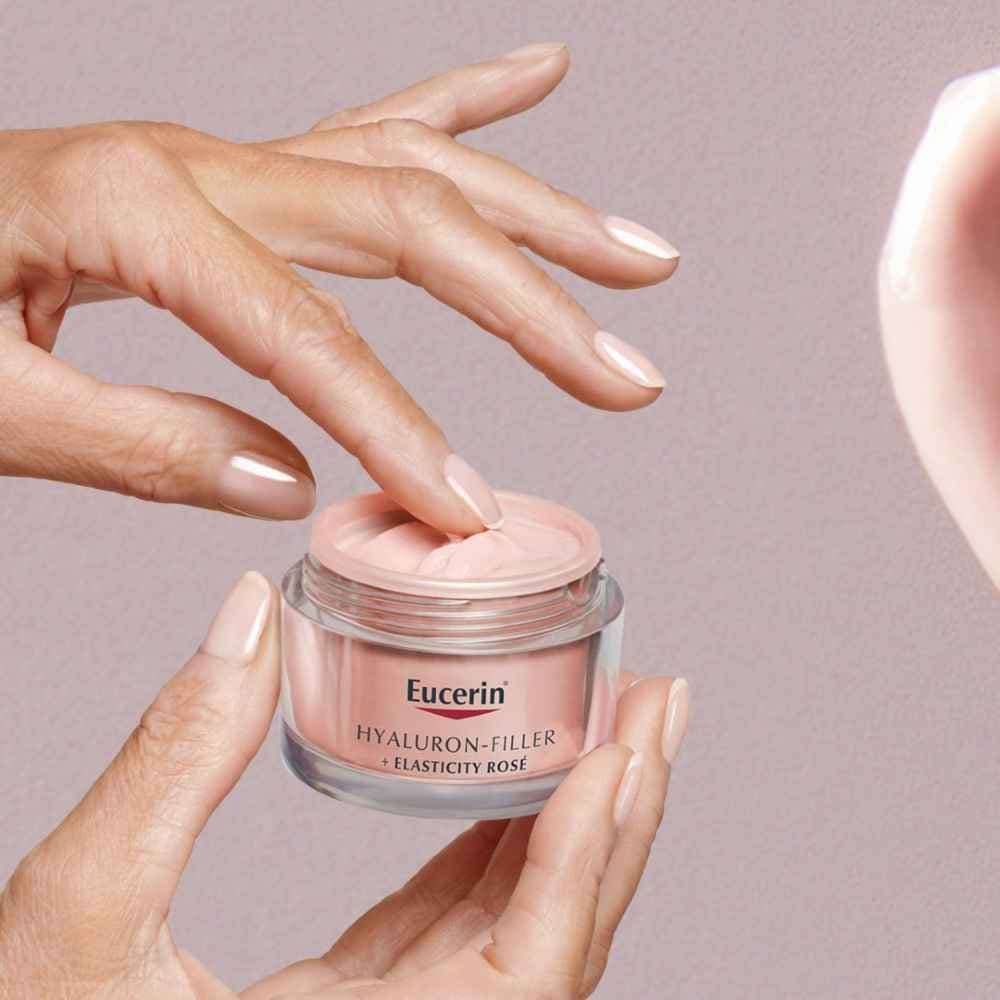 Eucerin Hyaluron-Filler + Elasticity Rosé dnevna krema SPF 30 trenutno pruža blistavost za smanjenje umornog i sivog izgleda, popunjava duboke bore, poboljšava elastičnost kože, smanjuje pigmentacije uzrokovane starenjem i trenutno vraća sjaj.