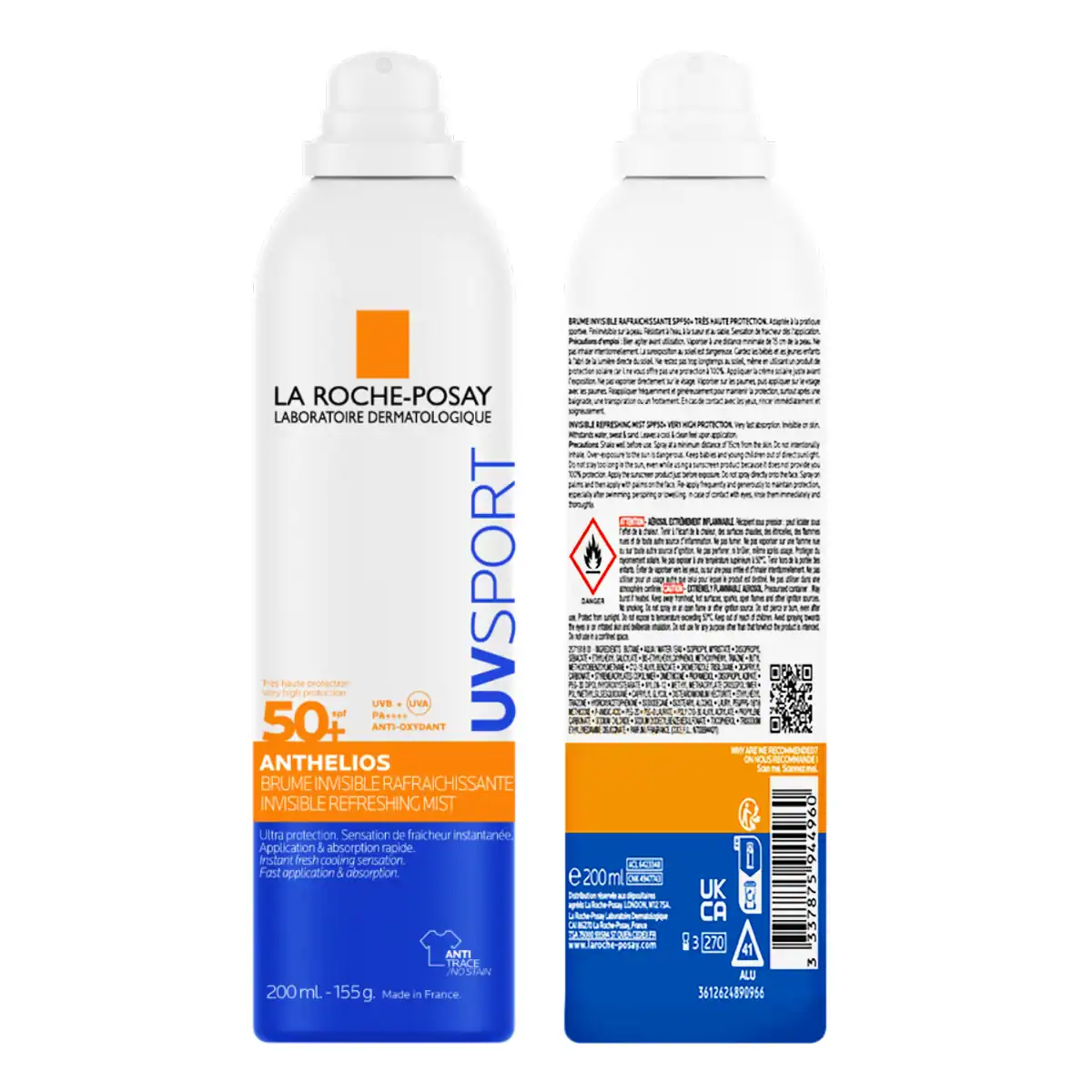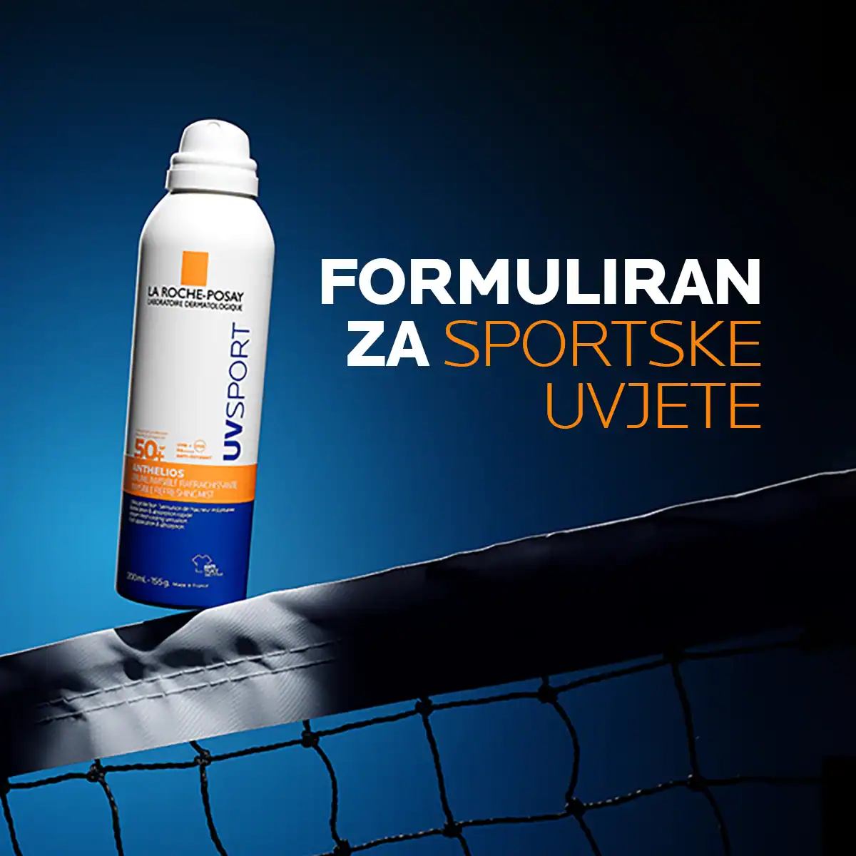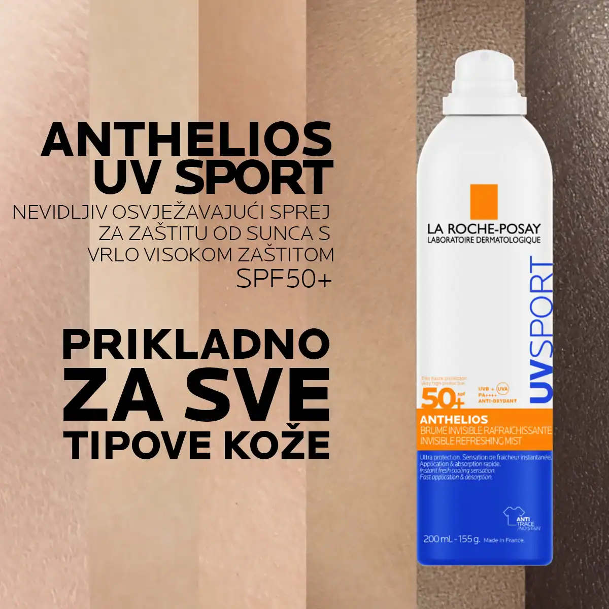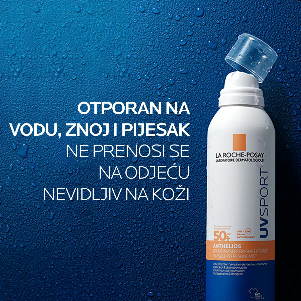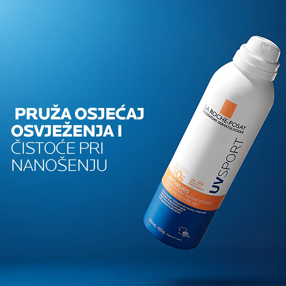 La Roche-Posay Anthelios UVSPORT Mist SPF 50+ je lagani, vrlo učinkovit sprej/mist za zaštitu kože od sunca, osmišljen za aktivne vanjske dane, sport i svakodnevnu zaštitu. Pruža vrlo visoku zaštitu SPF 50+ protiv UVA i UVB zraka, uz osvježavajući i gotovo nevidljiv završetak koji se brzo upija i ne ostavlja masni trag.