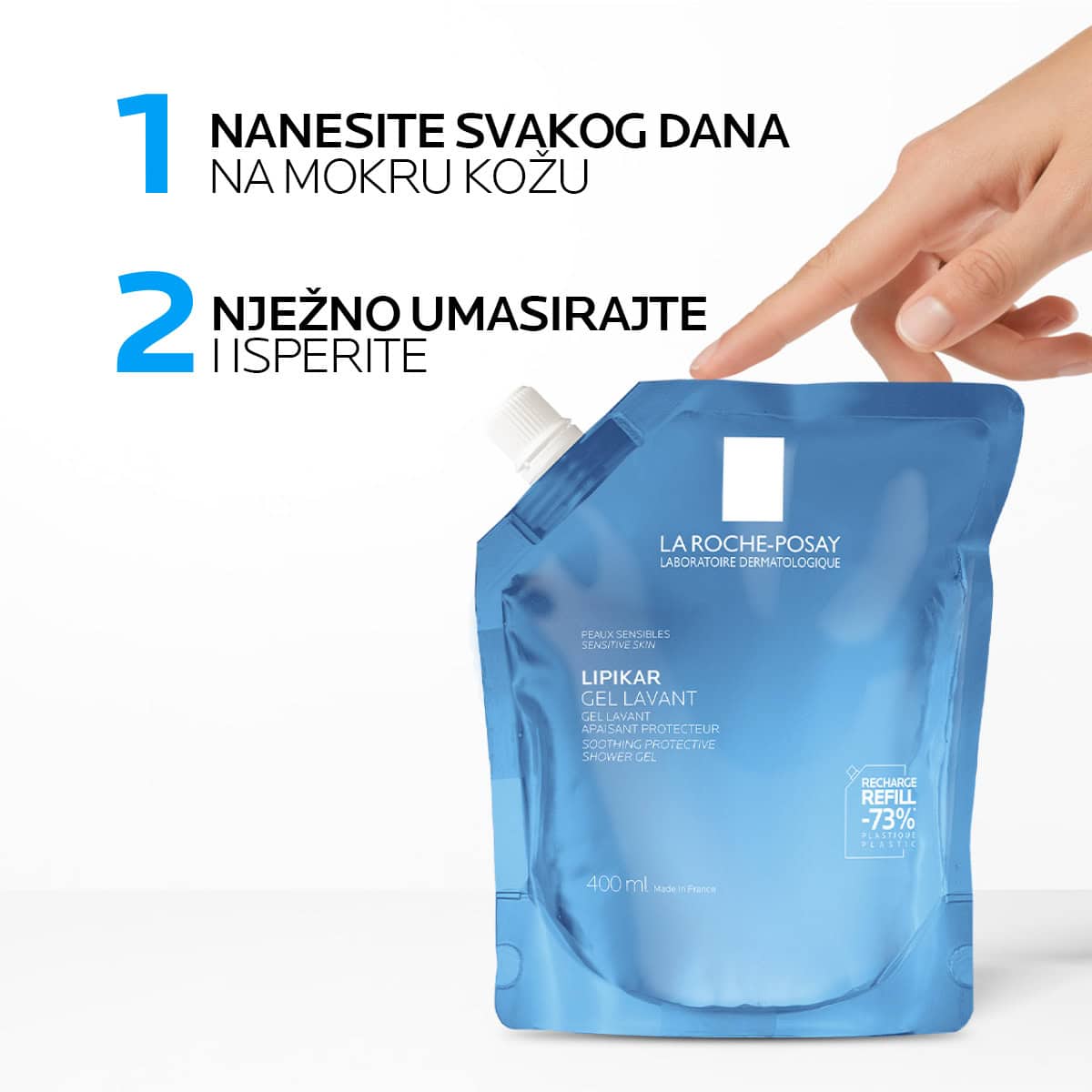 Nanijeti redovito na mokru kožu. Prikladno za primjenu na brojnim dijelovima tjela (lice, tijelo, vlasište kod novorođenčadi i intimna područja). Nježno umasirati i isprati. Brišite nježno, bez trljanja Za još bolje rezultate, poslije tuširanja, upotrijebite LIPIKAR mlijeko za obnovu lipida. Prikladno za vlasište kod male djece i intimna područja. Neutralizira loše utjecaje tvrde vode.