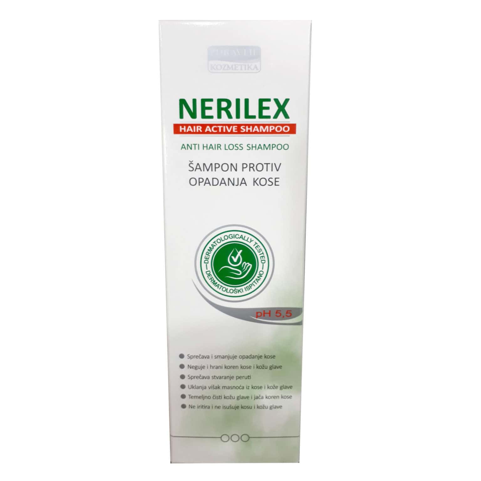 Nerilex šampon protiv opadanja kose sadrži aktivne supstance za pranje, koje temeljno čiste korijen kose i kožu glave, djeluju na sprječavanje preranog opadanja i prorjeđivanja kose i ujedno reaktiviraju korjen kose i stimuliraju njen rast. Reaktivirajuće djelovanje se postiže postupno redovitom i sistematskom primjenom šampona. Nerilex šampon za kosu je ugodnog mirisa, pH vrijednost je optimalno prilagođena koži (pH = 5,5), može se redovno koristiti za njegu kose.