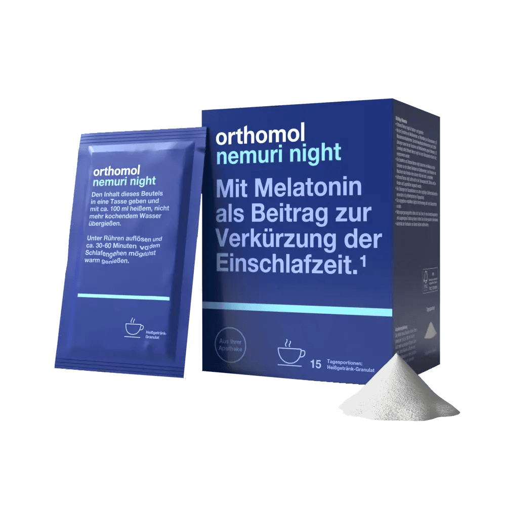 Orthomol Nemuri NIGHT granule za topli napitak protiv nesanice dodatak su prehrani sa melatoninom i biljnim ekstraktima – pasiflora i matičnjak. Smanjuju nervozu i napetost, skraćuju period uspavljivanja i poboljšavaju kvalitetu sna.