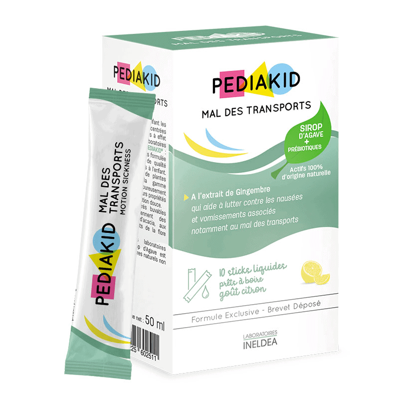 Prva pomoć za brzo sprječavanje mučnine i povraćanja. Budući da djeca često imaju probleme s mučninama i povraćanjem tijekom putovanja (bez obzira je li riječ o prijevozu automobilom, autobusom, zrakoplovom, brodom…) proizvođač PEDIAKID® razvio je formulu koja je posebno prilagođena najmlađima – na bazi aktivnih sastojaka 100% prirodnog izvora. Napitak sadrži prirodne ekstrakte đumbira, metvice, kadulje, sikavice, limuna i naranče, koji učinkovito olakšavaju osjećaje slabosti i mučnine, ujedno ne ometajući normalnu probavu. Svaka vrećica sadrži tekući napitak koji je pripremljen za trenutačnu konzumaciju te ima ugodan okus limuna.