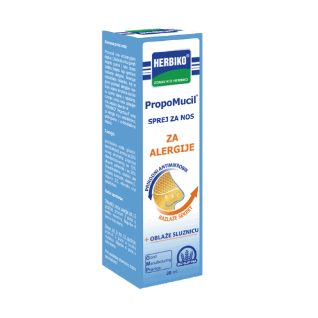Propomucil sprej za nos za alergije oblaže sluznicu gornjih disajnih puteva i stvara zaštitnu barijeru za prodor alergena iz vazduha i sprečava vezivanje alergena. Alergeni ne dolaze u kontakt sa preosjetljivom sluzokožom nosa i ne dovode do razvoja alergijske reakcije. Zahvaljujući kvercetinu smanjuje histamin, pa samim tim umanjuje simptome kao što su: kijavica, svrab, curenje i zapušenost nosa. Olakšava disanje!