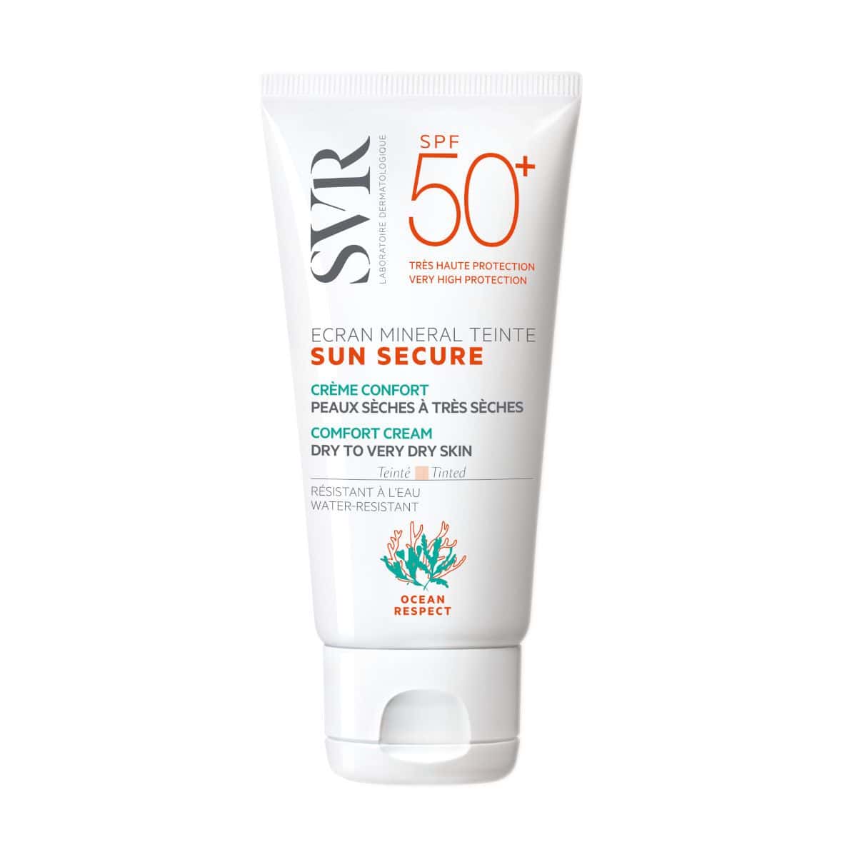 SUN SECURE Mineralna krema u boji SPF50+ nudi vrlo visoku zaštitu od sunca sa 100% mineralnim filterima. Ova ugodna tonirana krema za zaštitu suhe i vrlo suhe kože kreirana je za žene koje žele make-up na suncu tijekom cijele godine. Njena visoka sposobnost prekrivanja skriva sve nepravilnosti. Boja tena je ujednačena tijekom cijelog dana. Njena univerzalna boja odgovara svim tonovima kože. Otporna je na vodu, znoj i trenje za optimalnu zaštitu. Bez mirisa. Na bazi 100% fotostabilnih mineralnih filtera, pogodna je za zaštitu kože koja je netolerantna na kemijske filtere. Pruža visoku zaštitu od UVA/UVB/IR zraka. Pogodna je za zaštitu osjetljive kože na sunčevu svjetlost.