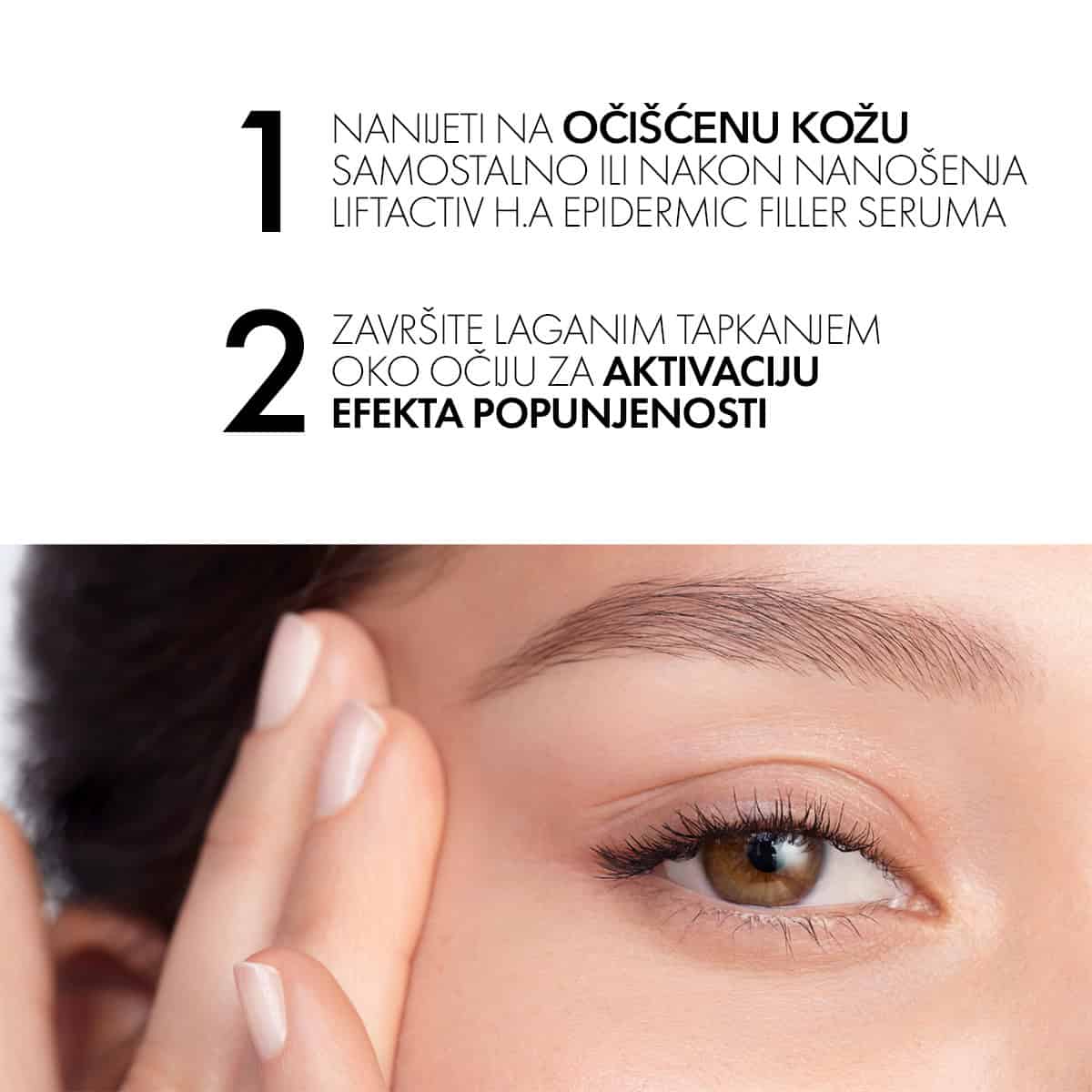 Nanosite ujutro i navečer laganim tapkanjem na cjelokupno područje oko očiju (podočnjaci, gornji kapak sve do luka obrve, bore u kutovima očiju). Nježno razmažite (bez pritiska) od unutarnjeg kuta oka prema vanjskom, potom jednako tako nježno utapkajte njegu. Nanošenje završite u vanjskom kutu.